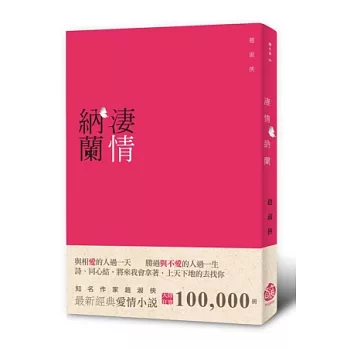 1. 金鼎獎作家趙淑俠,自《賽金花》後,迄今十年,閱讀史料查證歷史歷經多年,終於將這部兼具歷史價值及浪漫經典愛情故事的《淒情納蘭》完成。